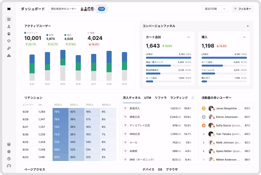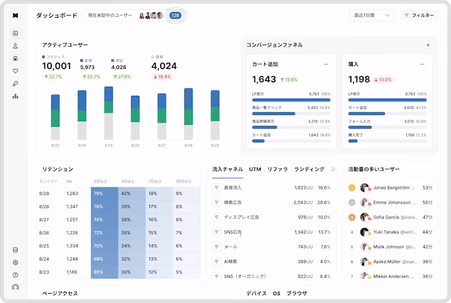 ウェブサイトの流入・コンバージョン・来訪頻度をひと目で把握。AIが変化を検知し、要因を解析。