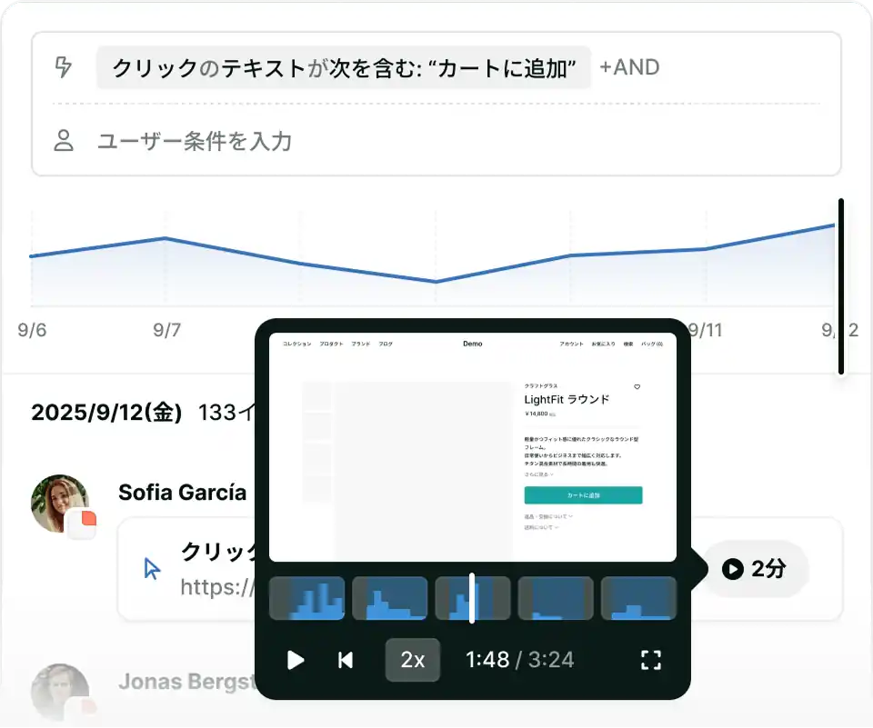 気になるユーザーや行動をイベントで検索し、該当シーンから再生。見たい操作をすばやくキャッチアップできます。
